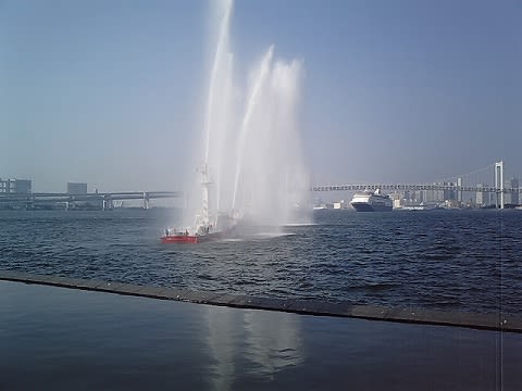 船上から見る歓迎放水っていうのも格別ですよね。晴海はこの点に関してだけは頑張っている方だと思います。毎回、二隻出てきますからね。横浜や神戸、大阪はいつも一隻ですけど。でも折角二隻出すなら、もっとフォーメーションとか考えて欲しいんですよね...(^^;)