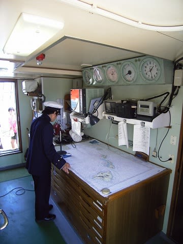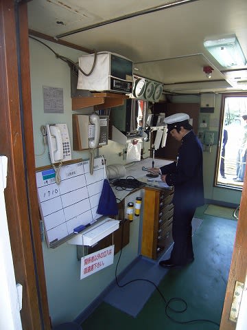 船内アナウンス。「本日はご乗船いただき誠にありがとうございます」。。昔はドラを鳴らしたこともありますよん。 操舵室にはよく遊びに行ってたな。。。 あ〜〜〜昔話でした。