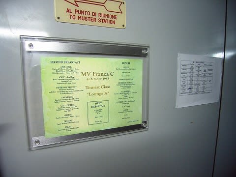 船内ゆっくりツアーが出来て良かったですね。前回、名古屋寄港時には、(ドウロス)変遷写真はありませんでしたが、ギネス証明書がフレーム入りで展示していました。(フランカC)ツーリストメニュー見ると、落差を感じるでしょう。