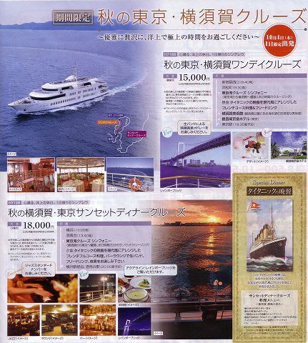 船籍:東京 総トン:1084トン 船長: 70.00m 船幅: 10.50m 喫水: 2.57m 速度: 12.80ノット 定員: 450名 造船所:神田造船所 川尻 建造年: 1989年 〔価 格〕大人 15,000円、小人 14,500円 〔旅行日〕平成19年10月4日(木) 〔コース〕 新宿駅西口(8:40発)==浜松町(9:30発)==東京湾クルーズ シンフォニー(東京から横須賀へ優雅に約3時間のクルージング。昼食:創作フレンチコース料理。フリードリンク)==横須賀美術館(観音崎公園にある海を望むお洒落な美術館)…観音崎京急ホテル(ケーキセット)==東京駅(18:00着予定) 〔その他旅行条件等〕 *荒天により横須賀への航路の運行が不可能な場合には、東京湾周遊クルーズ(所要2.0時間)となります。 またその際は、横須賀への移動はバスにて運行となります。予めご了承下さい。