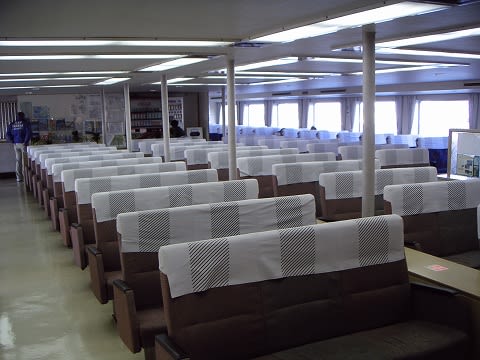 客室。右舷側後方には売店のスペースがあるようですが、シャッターが閉まっていました。