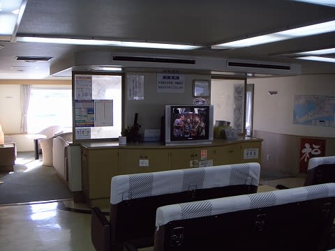 船首側客室。テレビの裏側は展望室になっていて、進行方向の展望ができます。 ソファ席ですが、特別な料金は必要ありません。早いもの勝ちですね。 ちなみにソファは固定されており、動かせません。