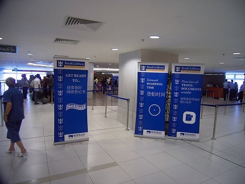 事前に旅行社さんからは『12:00くらいからチェックインできるかも』っていう情報はもらっていたので少し早めに出かけていたのです。 さて、ここでRCIの場合のチェックイン情報を... RCIはオンラインで事前チェックインができます。 クレジットカード情報の登録が主な内容ですけど、コレをやっておくとおかないとでは、窓口での時間が大きく異なります。 このオンラインチェックインをすると、"SetSail"というドキュメントが発行されます。これに必要事項(クレジット清算のレートをRCIレートでするかカード会社レートでするかの選択をするだけです)のチェックと署名をして持っていくと、いわゆる"エキスプレス・チェックイン"ができます。 上の写真、看板が三つありますよね? その一番左側が"SetSail"書類を持っている乗客のチェックイン通路になります。 コレだと早いですよ。手続きそのものが早いので、多少列があってもすぐにはけます。 並んでからものの10分ほどでチェックイン終了。早っ...(^^;) チェックインでは"SeaPass"と呼ばれるいわゆるパッセンジャーカードと、タイ、シンガポールのイミグレーションカードが配られました。イミグレーションカードは乗船時に回収するということで、記入をしておいてくれといわれました。 最初のバスは14:00に出るとのこと。 それまでターミナルの中を散策することとします。