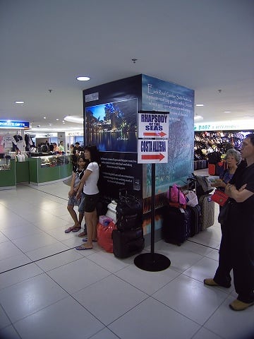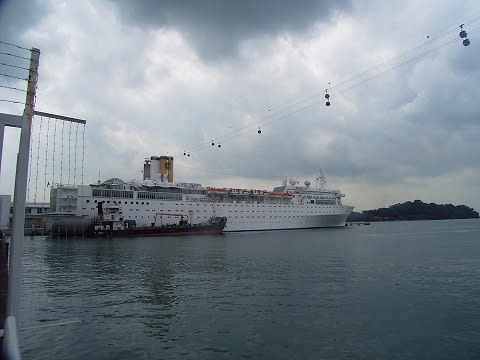 ハーバーフロントのクルーズターミナル。 前回シンガポールを訪れたときは、MRTなんか繋がっていなかったし、現在のような大規模なショッピングモールはありませんでした。でも現在はすっかり繁華街の様子。周辺はすごい混雑でもうびっくり...(^^;) 隔世の感がありますね。 チェックインは14:00からとなっていますが、バゲージのチェックインは始まっていました。ターミナル横のバゲージチェックインで事前に配布されていたタグをつけてチェックインします。キャビン番号とnameがちゃんと印刷されたタグでした。 ただねぇ...クレームタグがもらえなかったのがちょっと不安でした。 この日は実はコスタ・アレグラも出航日になっていて、バースにその姿を晒していました。