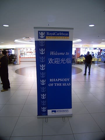 写真を見てお気づきかと思いますが、肝心のラプソディーがいません。 そうなんです。実は、チェックインこそクルーズターミナルですが、船は遠く離れたコンテナ埠頭に停泊しているそうで、このターミナルからバスで移動するんだとか... 後で調べたら、"PASIR PANJANG"っていう埠頭だったようです。 ターミナルの中は歓迎モード一色。