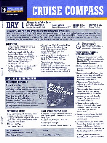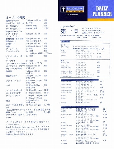 日本語版は英語版のスケジュールの部分だけの抜粋版。 しかも日本語が変...なんだかいかにも機械翻訳のような... スタッフに日本人が居るわけではなく、日本語OKと自称するチャイニーズのクルーが乗船していただけのようで、日本語の扱いはドキュメントのみならず、アナウンスも含めてクルーズの期間中ひどいものでした。 後で聞いた話だと日本人は166人も乗っていたそうな。 添乗員付きツァーで乗船してる人数もそうとうだったと思うのですが、どうも今回は添乗員諸氏は船内の日本語案内についてはノータッチだった様子。チェックしてあげればいいのに... まぁ自分のところのお客さんの世話で精一杯だったんでしょうけど... 乗船中、あちこちで添乗員氏と相談してる乗客さんを見かけましたから。 閑話休題...船内新聞の話に戻すと... もう日本語版はあてにならないので英語版を読むことに。 で、改めてみてみると、なんだか随分と様式が変わってしまったんですね。 イベント案内が表紙の一ページだけ。 見ててもわくわく感がありません。 このとき、なんだか一抹の不安がよぎったんですよね... その不安の正体は後刻...