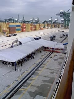 リアルタイムでもご報告しましたが、船が停泊していたのはコンテナターミナル。 クルーズターミナルからバスに揺られて15分ほどでしょうか... このコンテナターミナルがとにかくでかい!! 埠頭のゲートをくぐってからなかなか船が見えないんですよ。 この規模にはちょっとビックリです。日本にはこんなとこ無いなぁ... 敵う訳無いです。 コンテナターミナルそのものにはあんまり関心が無いので、撮った写真はリアルタイム投稿で撮った一枚だけです。