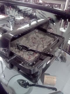 今回はセカンドでした。実はファーストは取れなかったんです。 食事のスタートはだいたい夜8:00でした。 いままで乗ってきた船は、ファーストの裏でセカンド乗客のためのショーが行われて、セカンドが食事をしている裏でファーストのショーっていう時間割だったのですが、この船はそういうことはしていなくて、セカンドのショーはディナーの後にスケジュールされていました。 ちょっと面食らった出来事でしたね。 というわけで、夜8:00にダイニングへ向かいます。