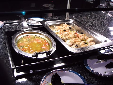 私たちはセカンドシッティングなので、普段だとファーストの裏の時間に当たるこの時間帯で夜8:00までは特にイベントらしいイベントがありません。ただこの日は、ディナーの前にキャプテンズパーティがあります。 今回のクルーズではディナーは全部メインレストランでいただいたのですが、ビュッフェも気になるのでちょっと覗いて見ました。 これ、スープなんです。左に積まれているのはスープの具になります。