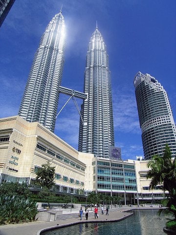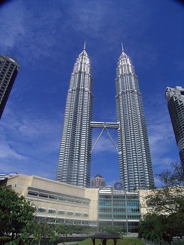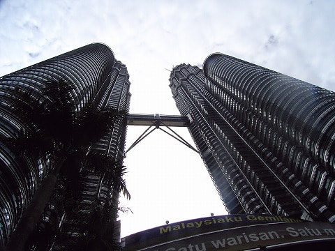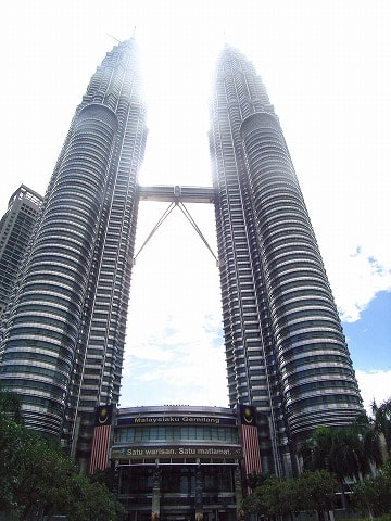 ペトロナスツインタワーは、1998年に完成した超高層ビル。ペトロナスタワー、ペトロナスタワーズとも呼ばれる。 20世紀の高層建築としては最も高い、高さ452mの88階建てで、マレーシアの国立石油会社ペトロナスによって建築された。 設計はシーザー・ペリ&アソシエーツ。 この塔はイスラム様式でマレーシアのモスクに似せて作られており、特徴的な尖塔を持つ。 建設当時はこの尖塔を含めた高さで建築物世界一を誇っていたが、2003年10月17日に中華民国・台湾の台北国際金融センターに世界一の座を譲り渡した。 ただし、二本のビルが対になっているツインタワーとしては依然として世界一の高さを誇っている。 建築に関しては日本の建築会社ハザマがタワー1を、韓国のサムスン物産建設部門がタワー2を、それぞれ建設した。なお、2本のタワーの41階と42階を結ぶ連絡橋(スカイブリッジ)は、フランスの建築会社による施工である。 構造的特徴としては、海側から吹いてくる強風による振動を防ぐために、既存の柔構造を採用しなかった点にある。軽量のコンクリートをくみ上げる方式をとっており、この種の構造物としては重厚な造りになっている。 (出典:wiki)