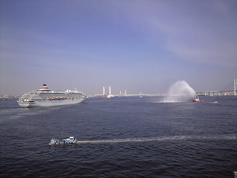 これが携帯で撮影したとは、驚きです。 飛鳥Ⅱ、消防艇、小型船の配置が、絶妙です。ポチ