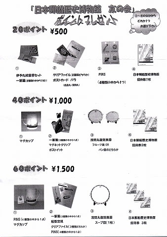 会員には下記特典があります。入会費・会費はかかりません。 特典その1:入館料の割引き 会員証提示により会員ご本人様に限り入館料を割引きします。 ○ 一般 500円 → 300円 ○ シニア(70歳以上) 300円 → 200円 ○ 中高生 300円 → 200円 ※ 有料イベントへご参加の場合は適用外となります。 特典その2:ポイントでプレゼント! 入館1回、ショップ利用500円につき、スタンプ1個を押します。20個(カード1枚分)で500円相当、40個で1000円相当、60個で1500円相当のミュージアムショップ商品を差し上げます。