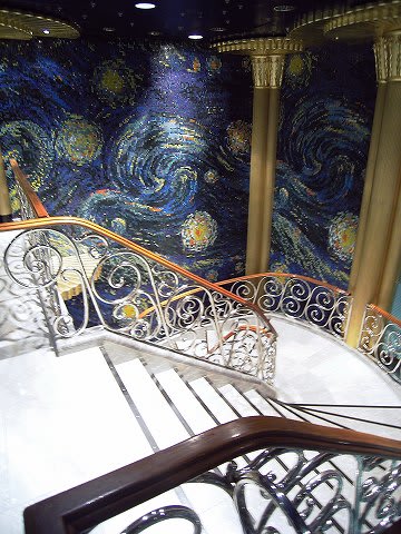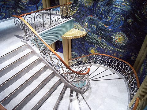 このキャップ、欲しかった... ヴァンゴッホラウンジ(シアター)です。 ここは2層吹き抜け構造になっているので、階段があります。