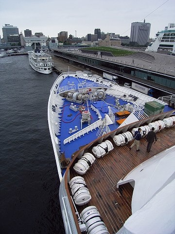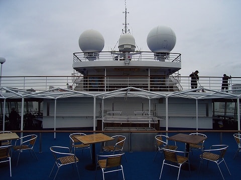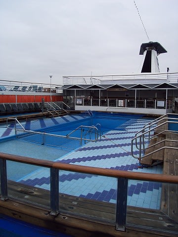 おはようございます。 ラプソディー入港後私も船内見学しました。 ブリッジ先端までは行けませんでした。立ち入り禁止! B旗が揚がっていた為でした。残念! 午後1時頃7デッキはちょっとガソリン臭かった感じがしました。 スタッフが消臭スプレーをしていました。