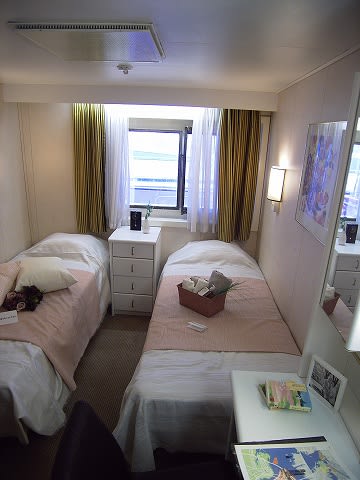 アクエリアスにもプロムナードから丸見えのお部屋があってね このお部屋に泊まったら かなり嫌かも〜って思った記憶が・・・。 お部屋数を増やす事で 航海の料金がお安くなるの? 日本人には何とかなっても 狭いベッドに寛ぎ感が持てそうにないですね〜〜〜(T@T)r