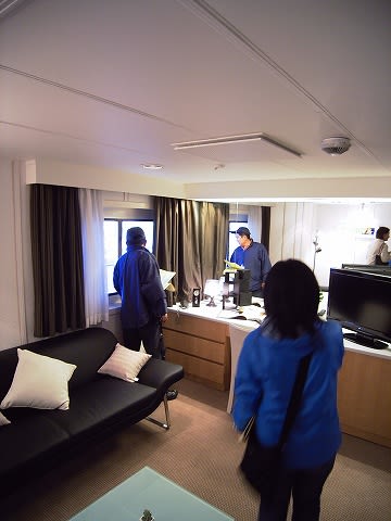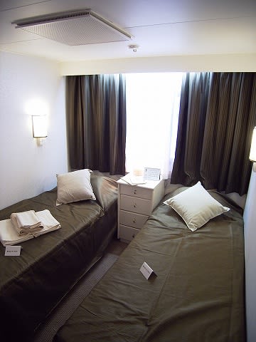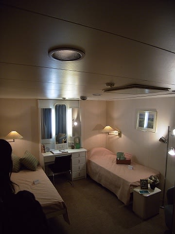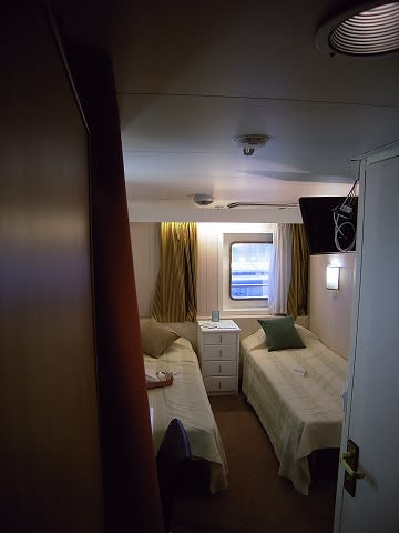 外から丸見えなのは勘弁ですね、それ以上にプールの中が見える窓があるというのはどういう意図なのだか・・・(笑 確かにキャビンは狭いですね。ビジネスホテルよりも狭そう。まあ、航海中ずっと部屋にこもっている人はいないでしょうけど。