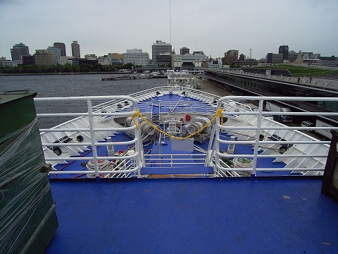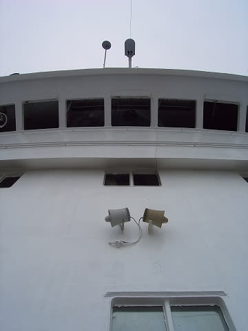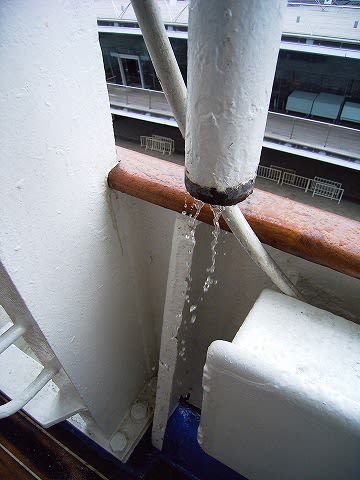 雨どいが途中で切れちゃっているので、水がデッキに散水状態。 一応、ウッドデッキなので、かなりすべる状態になってしまいます。 ちょっと継ぎ足して下まで伸ばせばこんなことにはならないはずなんですが... プロムナードを歩いて船首の方へ出ることができます。 ブリッジの真下。船正面です。