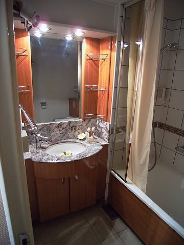 一応、液晶モニターは各キャビンに設置されていましたよ。何を放送するのかは解りませんが… あの洗面台はスィートオンリーですよ。というよりは、"スィート"でもあの程度です。