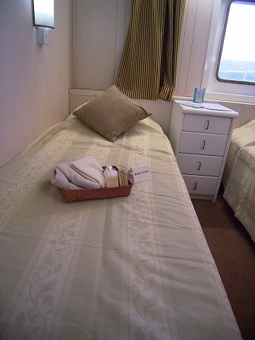 このデッキにはプロムナードがあるわけですが、実は窓側のキャビンは全部、室内がプロムナードから丸見えです。これはちょっとどうかと...私ならパスですね... "マイキャビン"(ペアスィート) 寝室です。