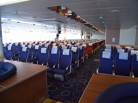 確かに映画館のようでもありますね。というか船らしくない(笑 同じフェリーでも東京湾フェリーとは雲泥の差。これだけの設備ですから、電車で言うジョイフルトレインのような使い方もできそうです。もっとも、そんな運用が可能なら運休にはならないのでしょうけど。