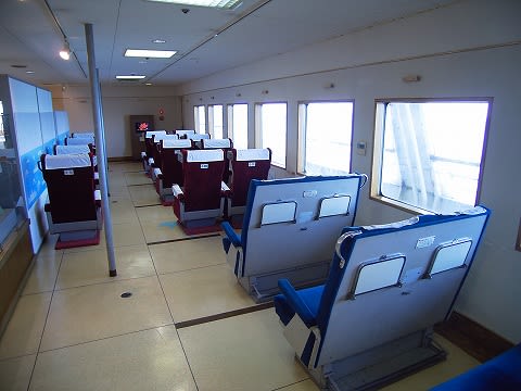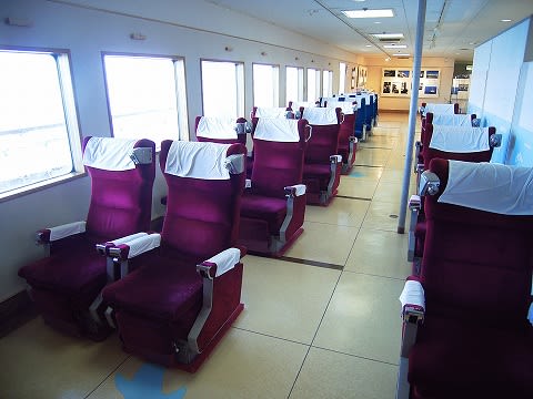 実は摩周丸は現在も法規上はれっきとした船舶であると同時に、海上に浮かぶ建築物とも見なされていることから消防法や建築基準法も適用されるため、この基準に合致していない部分は公開することが出来ないんですね。 公開されていないのは、普通船室・グリーン自由席・貨車甲板・機関室・総括制御室などになります。 お台場の羊蹄丸などは貨車甲板なんかも展示してますけどね。 グリーン自由席などは窓越しに見ることが出来ます。 エントランス正面の銘版
