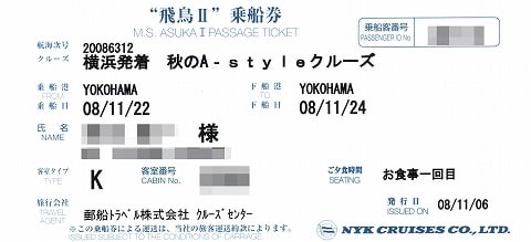 飛鳥II 秋のA-styleクルーズ 乗船券来ました。
