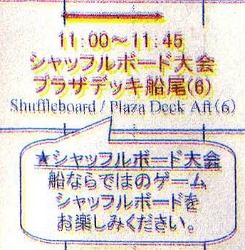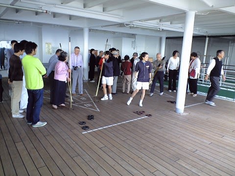 シャッフルボードは意外と難しいですよね。 外国船はすべりが悪くて私などは全然得点圏に届きません。 飛鳥IIのボードはいかがでしたか?