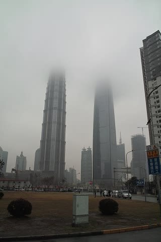 こんばんは。 浦東のGRAND HYATTが入った金茂大厦とPARK HYATTが入った栓抜き森ビル?とどちらも雲の中ですね。。 2004年に金茂大厦の79階に泊まりましたが、その時は電力不足でライトアップ無しでガッカリした経験ありです。 栓抜きの森ビルも泊まりに行ってみたいのですが、こんな天気の日だったら、ドタキャンですね、、、^^ゞ