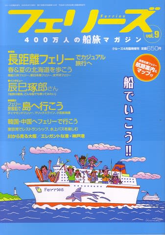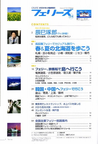 ■トップ・インタビュー 辰巳琢郎さん ■長距離フェリーでカジュアル旅行へ フェリーの旅には、日常では味わえないスケール感がある。行き先が北海道なら、開放感や爽快感も加わる。苫小牧と小樽、ふたつの玄関口に降り立ったとき、心の中には、あれやこれやと北国の夢が浮かぶだろう。春&夏の北海道、人気スポットを紹介。 □春・夏の北海道を歩こう ■島にはフェリー&旅客船で! 日本は約6,900にのぼる島嶼で構成されているという。多くの離島に恵まれ、島の足として、たくさんの船が島を結んでいる。ふと、島に行ってみたいと思ったら、近くの島々を船で訪ねてみよう。島民のあたたかな笑顔、島ならではの自然、島ならではのお料理がきっと出迎えてくれるだろう。 屋久島・種子島/奄美諸島/小笠原 ■海外旅行はフェリーで 青島/上海/韓国 ■レストラン船特集 ■ベイエリア特集 □大阪ベイエリアを楽しむ ”水の都”と呼ばれる大阪。中之島界隈は新しい建物も増えた。 京阪電鉄中之島線が2008年10月に開業し、道頓堀方面へは2009年3月に阪神電鉄なんば線も加わる。 今年、大阪では「水都大阪2009」と題しイベントが行われるという。 川から見た大阪の姿を見てみたいと思い立ちリバークルーズを体験した。 □神戸ベイエリアを楽しむ 2007年には開港140年を迎えた神戸港。 四国、九州、沖縄からだけでなく、韓国や中国ともフェリーの航路を結んでいる。 神戸港でフェリーを降りたら、歩いて街を訪れよう。 港街を感じさせてくれるはずだ。 ●全国主要フェリー航路案内 ●全国主要レストラン船&遊覧船スケジュール ★フェリーの旅をキャンピングカーで ★読者の声 ★Ferry’s Information ★Books ★読者プレゼント ★国内の116航路を一挙掲載