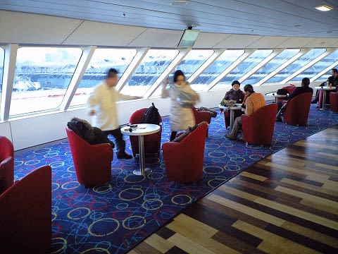 友人情報によると、今回のベイクルーズの航路は、V9 中ノ瀬アンカーって言うあたりまでの往復クルーズになるんだそうです。非常に短時間ではありましたが、皆さん、楽しまれたのではないでしょうか...見学会の時には開放されていなかった、ビジネスクラスや船尾のデッキも解放されてましたし。