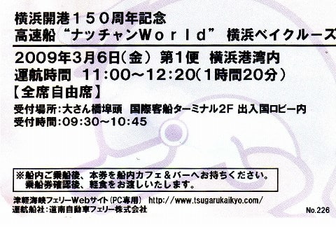 最初期の予定であれば、お出迎え後、大黒へ移動して船内見学って言うスケジュールだったのですが、これは早々に変更されて、見学が午後になってしまったため、午前中は自由行動というスケジュールになっていました。幸い、来航していたリベラさんの高速船"ナッチャンWorld"がベイクルーズをやると言うことでコレ幸いと搭乗を予約していました。