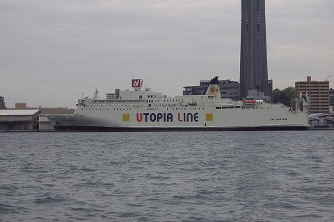 さて、下関のフェリーターミナルが近づいてきました。 まず最初に見えたのが上海下関フェリーの"ゆうとぴあ2"
