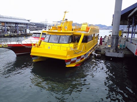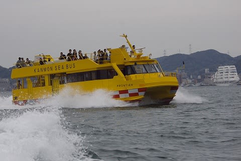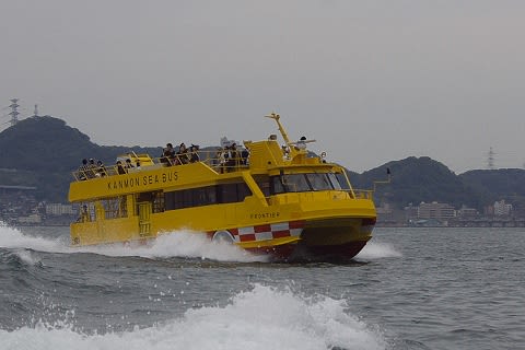 唐戸市場のすぐそばには唐戸桟橋があります。 ここは主に関門汽船の関門連絡船の発着所になっています。 最盛期にはなんと年間128万人もの人を門司へと運んでいたそうな... 現在でも年間30万人は利用者がいるそうです。橋もトンネルもあるのに...すごい。 やはり徒歩客には利用しやすいんでしょうね。 これならほぼ20分おきに船が出てるんですが... 実は今回の目的は海側から関釜フェリーが撮りたかったので、門司行きだと駄目なんですよね。 それで巌流島往復をすることにしました。 往復で1000円。 ま、いっかと思って乗船券を買った後で気が付いたのですが... こんな船もあったんですね...