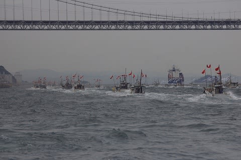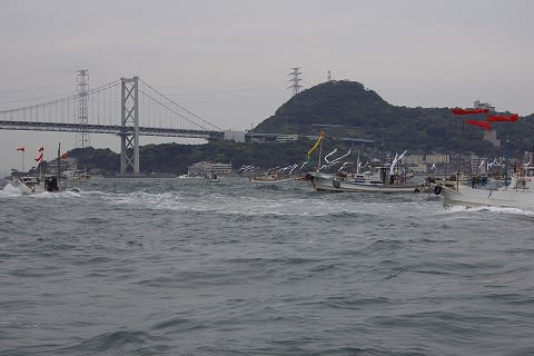 なんでも今年4月から就航していたそうで... こっちなら往復800円だった...orz しかも上部デッキに上がれば撮影に障害物なし!! 後の祭りです... まぁでも気を取り直して関門汽船の船に乗り込みます。 桟橋を出てすぐに、今日行われていた源平船合戦海上パレードにぶつかります。