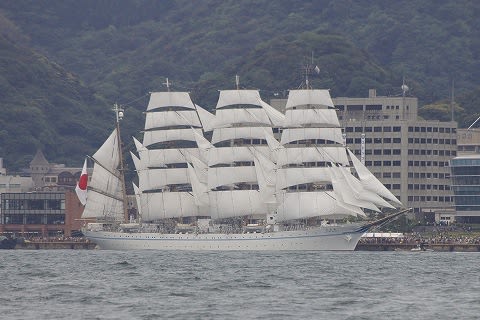 結構波が立っていて、迫力がありましたね... 門司側には"海王丸"停泊中。 この日はセールドリルの日だったようで... 総帆展帆を行ってました。