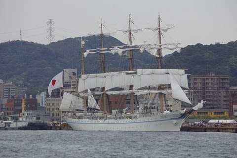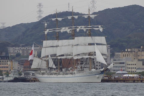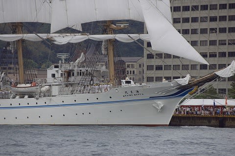海王丸のセールドリルはもう終盤のようです。帆をたたみ始めてます。