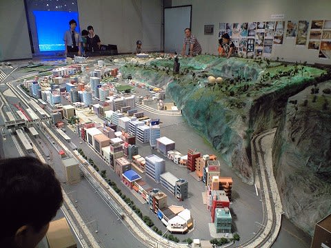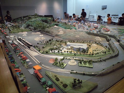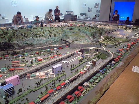 企画展の会場は2階になります。 今回の目玉は、やはりNゲージの大レイアウトでしょう。 ただ、配線的には、長大ではありますけど、割と単純なレイアウトでした。 走ってる車両も工夫が感じられない...(^^;) せっかく西武沿線なんだから、もっと西武関連の車両を走らせて欲しいなぁ... レイアウト全景です。