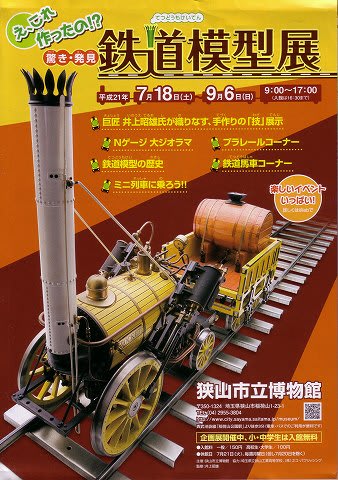 主催:狭山市立博物館 〒350-1324 埼玉県狭山市稲荷山1-23-1 電話 04(2955)3804 FAX 04(2955)3811 期間:7月18日〜9月6日(毎週月曜休館、7月21日)9:00〜7:00 入館料:一般/¥150、高校・大学生/¥100 協力:埼玉県立狭山工業高等学校、(株)ネコ・パブリッシング 監修:井上昭雄 みんなが大好きな鉄道模型の世界 そこにはワクワクするような技と情熱がたくさん詰まっています。日本で初めて鉄道模型が作られたのは、なんと幕末の1853年のこと。そんな鉄道模型の歴史を楽しみながら学んでみませんか? 模型作りのさまざまな楽しみ方と工夫を紹介。鉄道模型の世界の魅力に迫ります。 期間中、鉄道模型界の巨匠:井上昭雄氏の精巧な作品をはじめ、当館の博物館ボランティアが作った27畳の大ジオラマ、プラレール広場が登場。夏休みの宿題にピッタリの工作教室(要予約) も数多く開催します。ミニ列車の乗車体験などのイベントも盛りだくさんです。夏の博物館へどうぞ!!