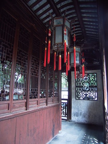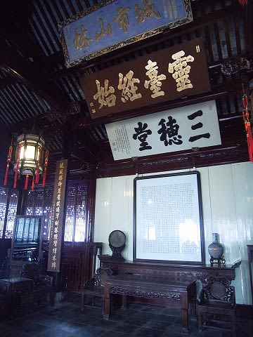 豫園でも最も古い建物のうちの一つで、しかも釘を使わずに建てられた構造物なんだそうです。屋根の上には、右側には張飛、左側には関羽の像があります。内部の正面に3つの額がかけられているが、これは、豫園の所有者が数回に渡って代わったことを示しているのだそうです。一番上の「城市山林」というのは、「豫園は街のなかのオアシスだ」ということを示しているのだとか...