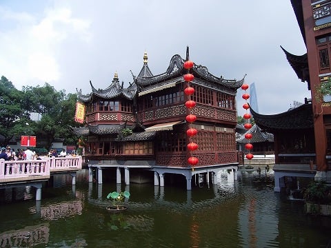 豫園入口の前に緑波池という蓮の池があります。 この池の中に建っている2階建ての東屋が湖心亭です。 ちょうど池の真ん中にあるから"湖心"なんだそうで...