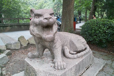 屋外の獣舎は工事中で、見ることが出来たのはこの1頭だけでした。 でも丁度お食事タイムで、活発な動きを見せてくれました。 なんか中国っぽい虎の像