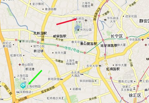 赤い矢印がホテルの位置。上海動物園は緑の矢印の場所です。