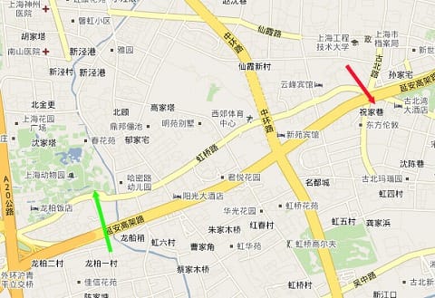 上海動物園(緑の矢印)からは一本道です。 地図上の赤い矢印で示したところが"古北家楽福"、カルフール古北店です。