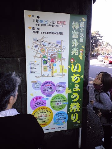 迎賓館を出て、左手方向。学習院の初等科と迎賓館の間の道へ入ります。 だらだらとした坂道。鮫河橋坂から安鎮坂と、結構な傾斜の坂です。 神宮外苑外周マラソンコースの難所ですね。 坂を上がりきった権田原交差点にあった銀杏祭りの看板