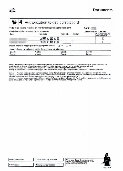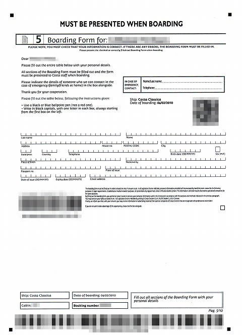 追伸:思い出してきました。 クレジットカードは船内の機械で登録するので書き込み不要です。 それと予約番号があればウェブチェックインしてプリントアウトできるので細かい字を書き込まなくてすみます。 パスポートを船に預けるので銀行では両替出来ないかもしれません。 ターミナルでの両替は出来ました。 細切れ書き込みでごめんなさい。