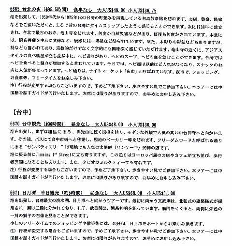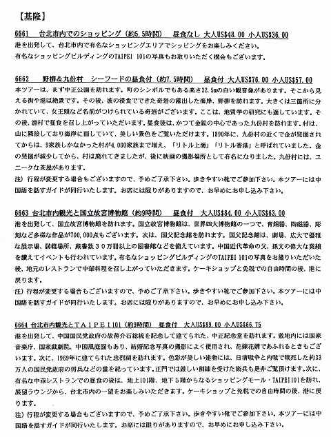 ハンドブックは弟に上げてしまいましたが、見た限りでは同じもののようです。 基隆の地図はクルーズセンターでもらえます。 日本人コーディネーターは愛さんと言います。 明日の午後2時から8日と20日のクルーズインサイドを19800円+港湾税で売りにだすそうです。 仕入れたキャビンが売れ残っているのでしょうか。