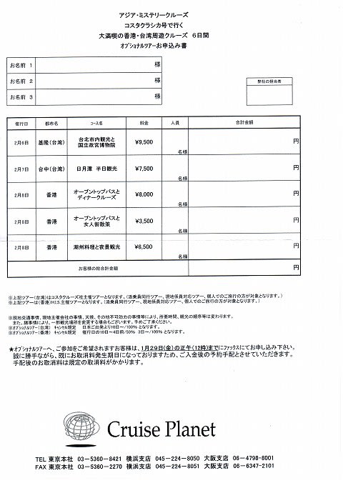 そして、クルーズプラネットさん主催の日本語寄港地ツアー申し込み用紙。