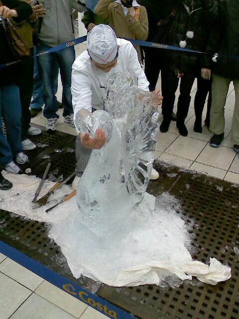 ひゃー 雨の中で氷の彫刻ですか 見てるだけで風邪引きそう
