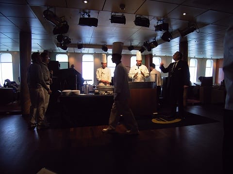こんにちは アレグラの経験から判断すると、キッチンデモは基本的にプールサイドで行うようです プールサイドでは寒いという気象から屋内での開催となったのではないかと思っています 今回のクルーズは、本来プールデッキの行事を屋内で行っていた印象が強いです。