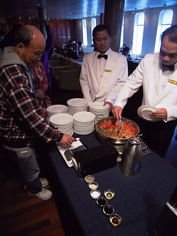 移動式の調理台が運ばれてきました。 でもなぁ... この位置関係だと、何処から見ても肝心の調理する手元は見えないんですよ... コレでいいのか??? どの船でもクッキングデモンストレーションってありますけど、まぁ、中でもHALのは設備的にも最高だと思いますが、逆の意味で、ここまで、見るほうを無視してるのも初めてな経験ですね...(^^;)やってくれるぜ、コスタ... まずはイタリアンなパスタから... 出来上がったパスタは試食で配られます。